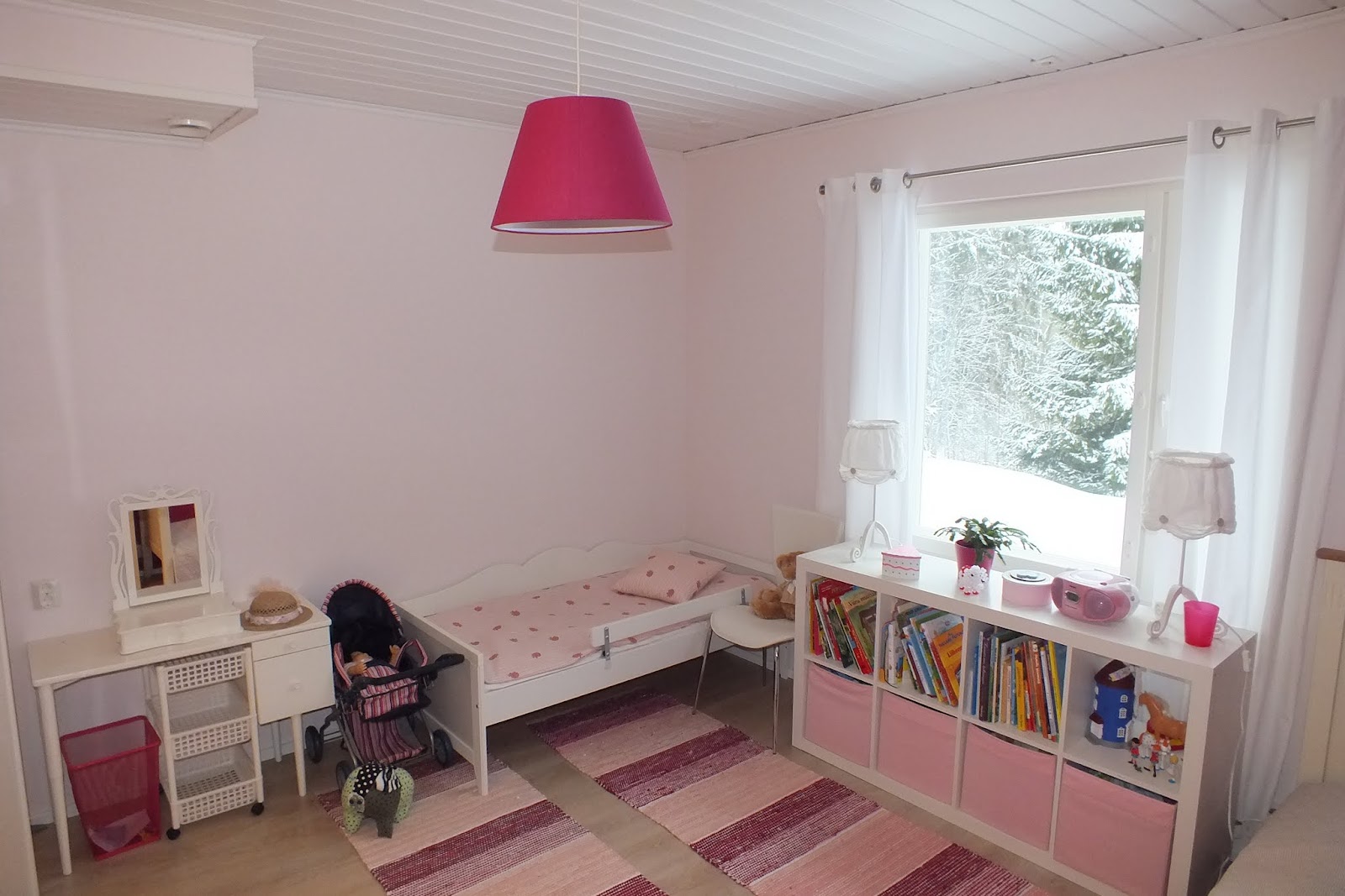 Meillä on paljon suunnitelmia tämän huoneen suhteen. Ainakin kerrossänky tuntuisi toimivalta, koska jäisi tilaa pian eskarilaisen ja koululaisen työpöydälle. Minusta on tärkeää, että koululaisella on oma läksypaikka heti alusta lähtien. Hyvä valo, ergonomia, rutiini ovat minusta hyviä syitä panostaa työpöytään. Kerrossänky onkin sitten ihan toinen operaationsa: esikuvia olemme katselleet Amerikan puolelta...