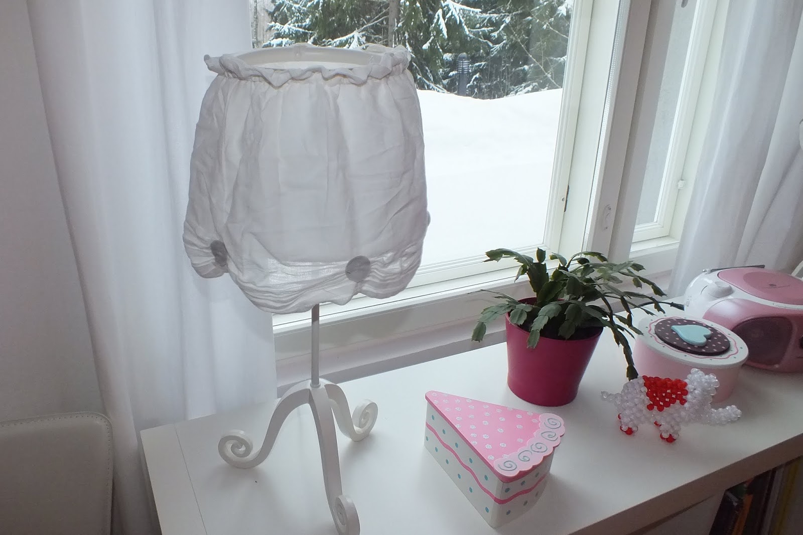 | Pöytälampun jalka iski tajuntaan ja se oli pakko saada. Varjostin vaikutti helposti uudistettavalta. Lisään siihen kangasnappien kohdalle varmaankin jotain fuksiaa tai koko varjostin vaihtuu. |