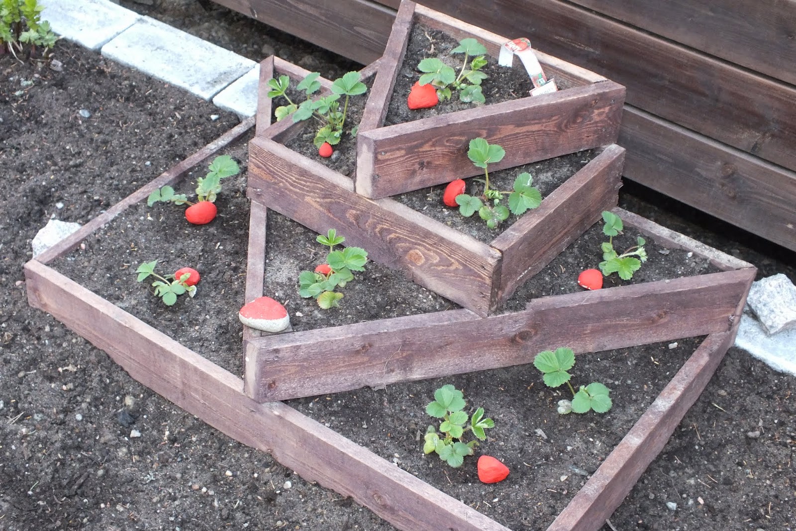 Nyt piti saada mansikkamaa, sillä mikään ei kuulu kesään niin täydellisesti kuin poimia punainen suuri auringon kypsyttämä ihanuus terassin nurkalta :-) Mutta metsänraivauksen sijaan rakensimme kohopenkin, mansikkatornin, tavallisesta laudasta. Pinotexia pintaan ja toivottavasti kestää muutaman kesän. Mansikkamaa ei yleensä ole kovin pitkäikäinen (näin olen kasvatusohjeista ymmärtänyt), joten tämä rakennelma on helppo purkaa pois, vaihtaa puhdas kasvualusta ja vaikka siirtää toiseen paikkaan.
